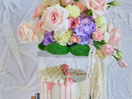 1 kilo Cake, 8 Rose sweet Sara, 1 Hydrangea, 8 Carnation, 4 Lisianthus, 5 Grass Stone, 3 Amaranthus and Accrelic.
