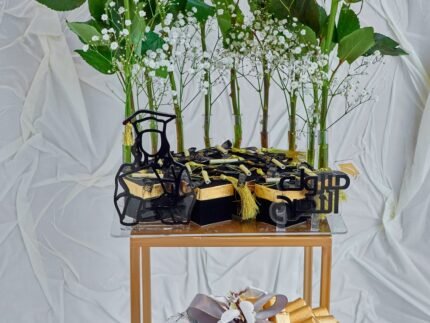 24 Cubes Chocolates, 7 Rose, 1 Stem Cymbidium, 5 Gypsophila and Black Stand