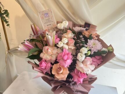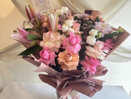 4 pink roses . 1liley . 4 biege . 3 astoloms . 4 white roses . ruskas . limonium