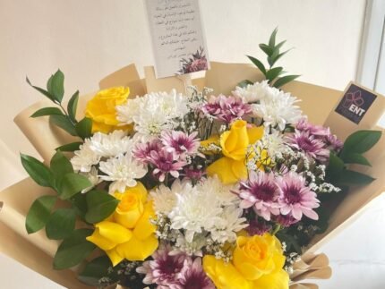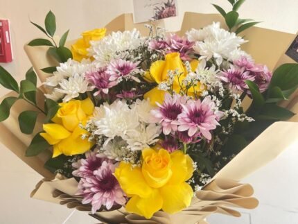 4 yellow roses . 5 cersantemom white . 4 cersantemom pink . ruskas . limonium