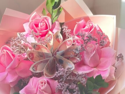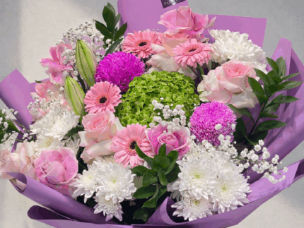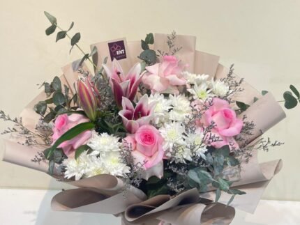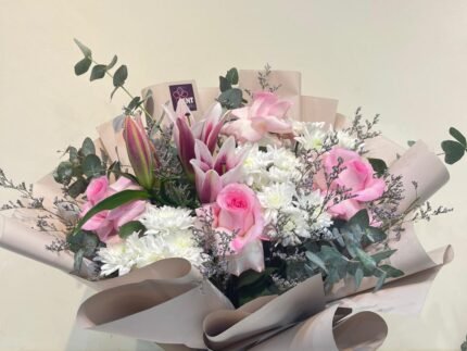 1 liley .4pink roses .3 cersantemom . aoklobtos . limonium