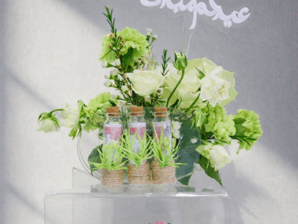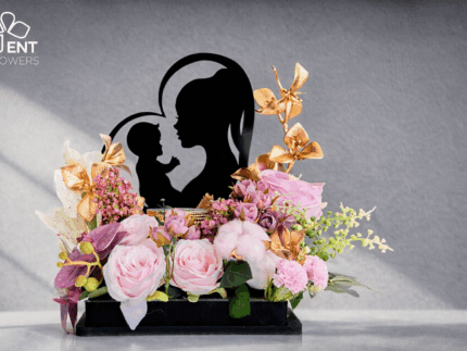 Stand Accrelic Black Mother., 1 Glass Gold in the middle, 1 Prurple Garden Rose, 3 Rose sweet Sara, 3 Baby Rose Purple, 1 Cotton Flower, 2 Baby Carnation Flowers, 3 Pink Syringa.