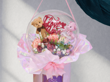 1 Tulip, 3 Baby Rose, 1 Nice Round Box, 2 Small Teddy Bear inside Ball, 1 Stck logo I LOVE YOU, 1 Accrelic Balloon, 2 Real touch Tulip.