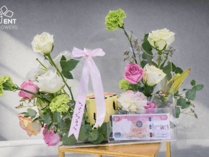Accrelic Bag 30x 30x 16cm, Mini Cake 10x 10cm, 1 Oriental lily, 5 Rose White, 4 Rose Revival, 2 Rose Sweet Sara, 3 Carnation and Money Box Accrelic.