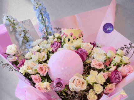 Mini Cake with Design Name on the top size 10x10cm, 4 Balloons, 8 Purple Rose, 8 Sweet Sara Rose, 8 Baby Rose solinero, 8 Lemonium, 5 Chrysantimum White, 2 Delphenium Blue, 5 Lisianthus.