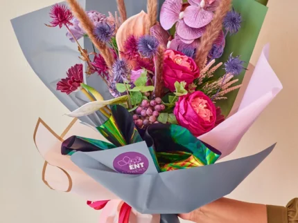 Accrelic Bag Clear w/ Handle rope Brown, 2 Syringa, 2 Dry Ruscus, 4 Astible, 5 Rose Sweet Sara, 1 Hyrangea, 1 Anthurium, Accessories and Stone white.