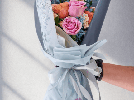 1 Stem Cymbidium, 2 Deco Pusha, 3 Garden Rose, 3 Tulip Pink, 2 Gerbera, 2 Syringa.