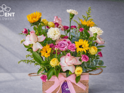 4 Rose 2 color, 4 Rose Purple, 3 Sun Flower, 3 Carnation Light Yellow, 4 Baby Rose Pink, 2 Bombastic Yellow, 2 Solidago, 5 Ruscus leaves, 2 Eucalyptus leaves and Unique Wood tray.
