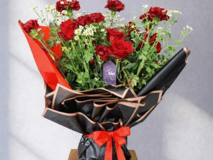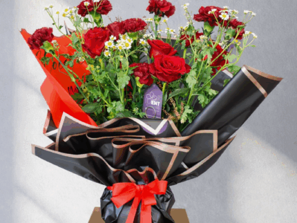 10 Red Nice Rose , 5 Red nice Carnation and White gypsophila , 5 Tanacetum flowers, and a nice wrapping