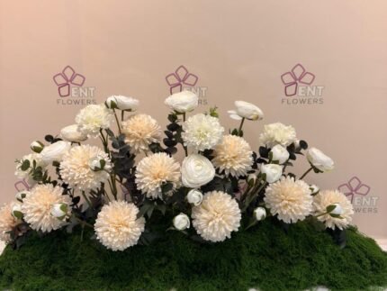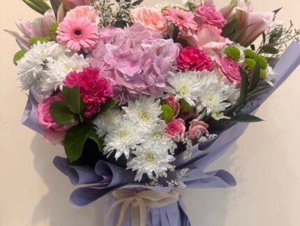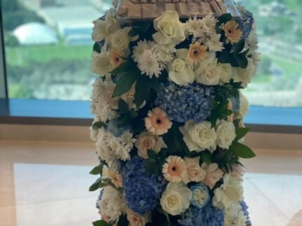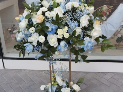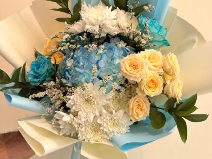 1 hydrangea . 2 cersantemom .3 baby roses . 3 blue roses . ruskas . Lamolium