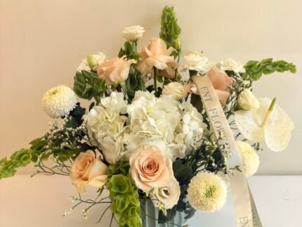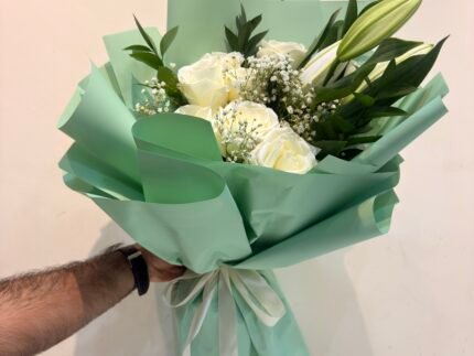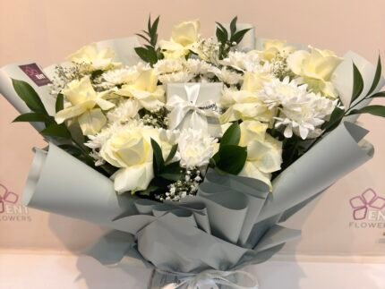 8 Diego Blue . 4 Crescent Mum White . 3 Lilies . 1 Anthurium . 4 Carnations . 5 White