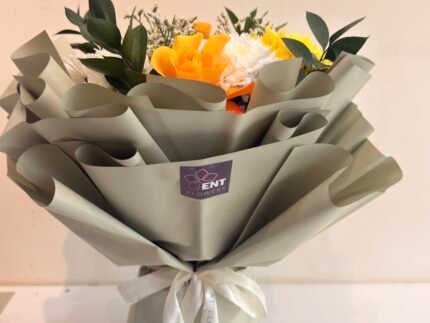 3 yel low roses. . 5 orange roses . .3 cersantemom . 2 lilys .ruskas . limonium
