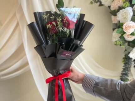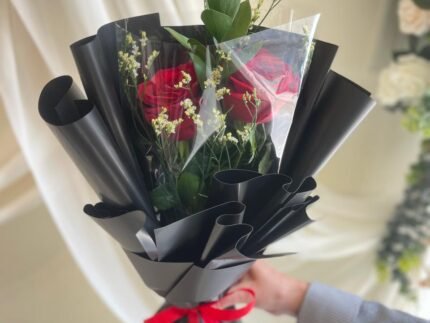 2 red roses . 2 pink roses . 1 cersantemom . ruskas . gepso