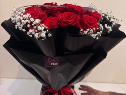 3 yel low roses. . 5 orange roses . .3 cersantemom . 2 lilys .ruskas . limonium