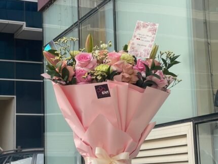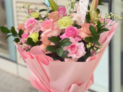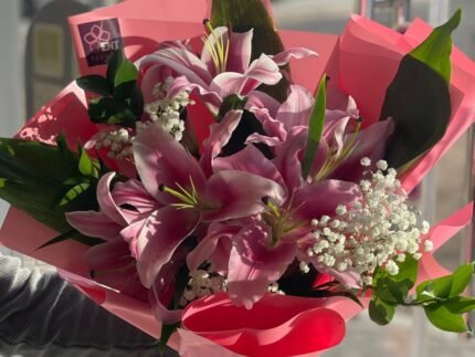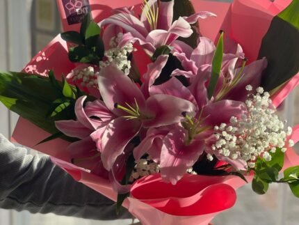 1 liley .4pink roses .3 cersantemom . aoklobtos . limonium