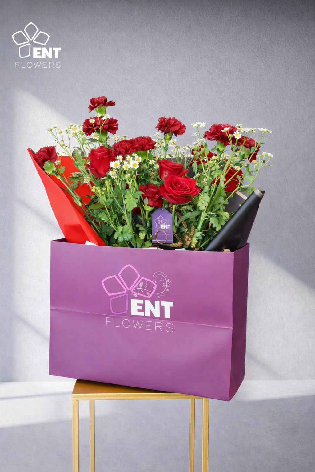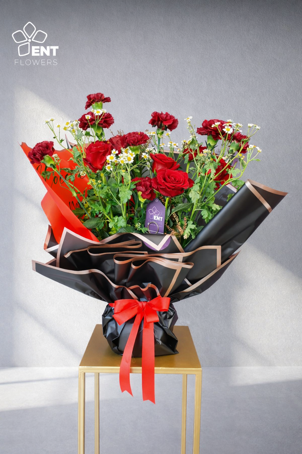 5 Tanacetum flowers, and a nice wrapping Black and Ribbon Red.