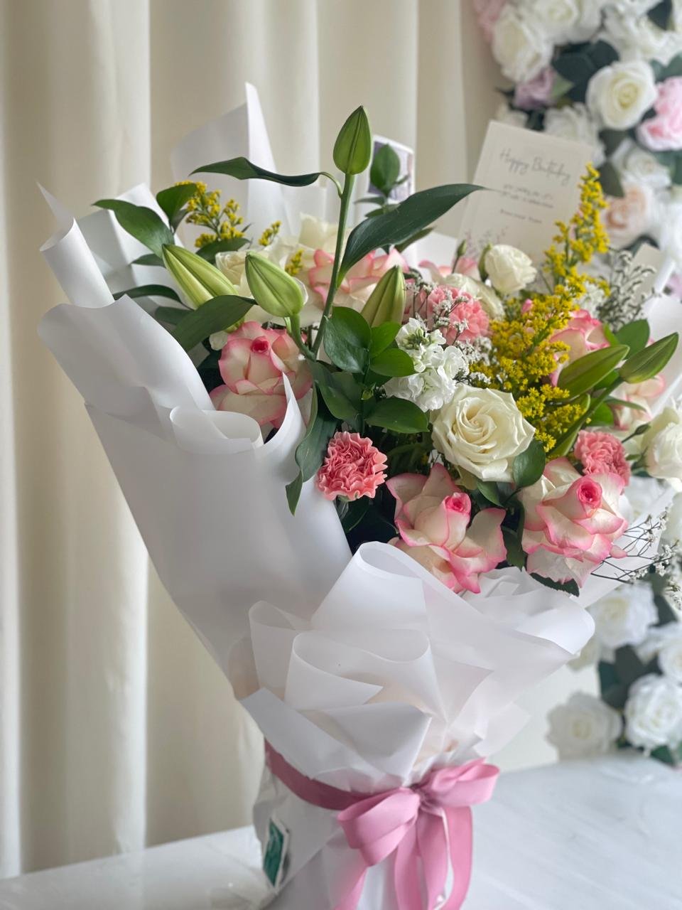 | 1 liley . 3 baby roses 4 pink roses , 4white roses . 3 astolola , ruskas . |