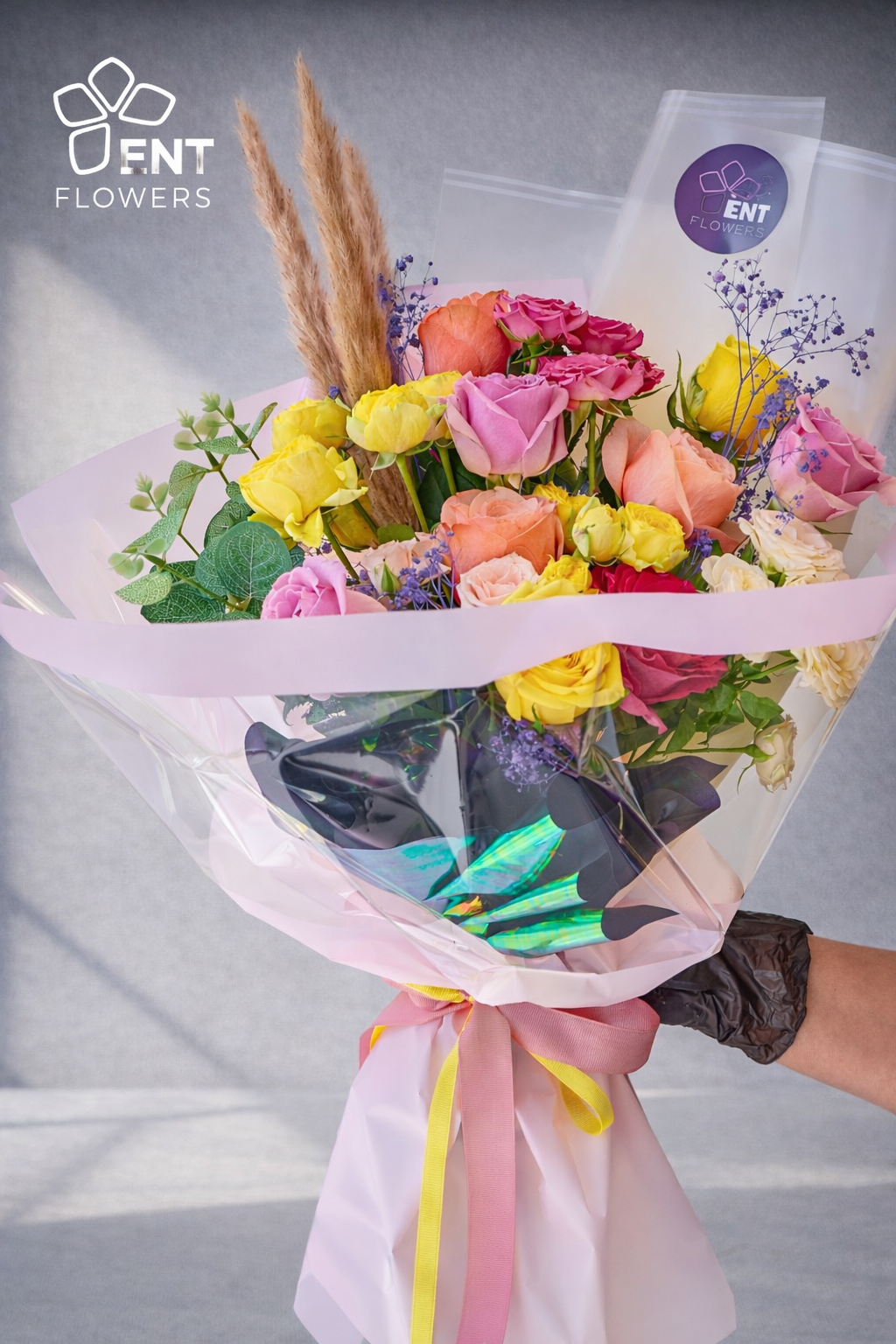 3 Pampas single brown, 3 Boombastic Yellow, 3 Kahala Rose, 3 Revival Rose, 2 Rose Yellow, 1 Baby Rose Pink, ! Solinero Baby Rose, Gypsophila coated purple cvolor, 3 Ruscus leaves.