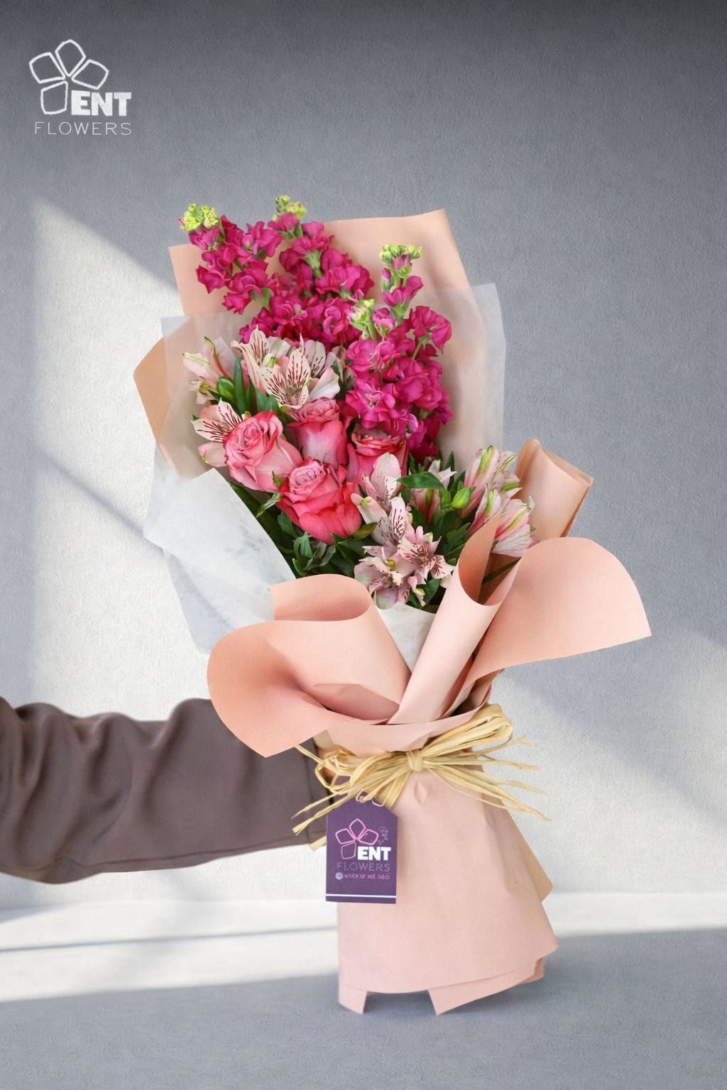 4stem Matthiola Pink, 4stem Alstromeria, 4pcs Purple Rose.