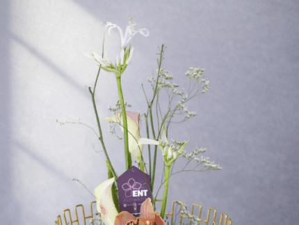 3 Rose White, 1Garden Rose. 1 Logo stick for Ramadan, 1 Moon Coated Gold Color, Accrelic with White stone, Accessories leaves Gold.