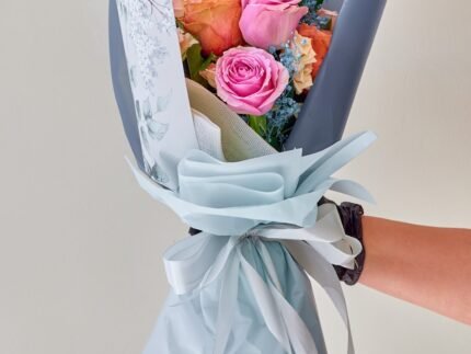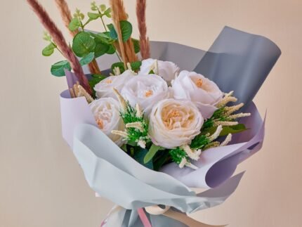 4 Kahala Rose, 5 Revival Rose, 3 Sweet Sara, 4 Blue Gypsophila, 2 Eucalyptus leaves.