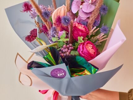 2 Anthurium Pink and White, 2 Deco Pink, 4 Ranunculus white, 1 stem Cymbidium Maroon, 4 Tulip Pink, 6 Peony Rose Pink, 6 Astible, 6 Dry Pampas, 10 Eucalypthus leaves.