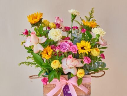 4 Rose 2 color, 4 Rose Purple, 3 Sun Flower, 3 Carnation Light Yellow, 4 Baby Rose Pink, 2 Bombastic Yellow, 2 Solidago, 5 Ruscus leaves, 2 Eucalyptus leaves and Unique Wood tray.