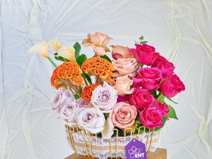 Gold Fruits Basket, 3 Cala Lily, 3 Celosia, 5 Cappuccino Rose, 5 Light Purple Rose, 6 Pusha Rose.